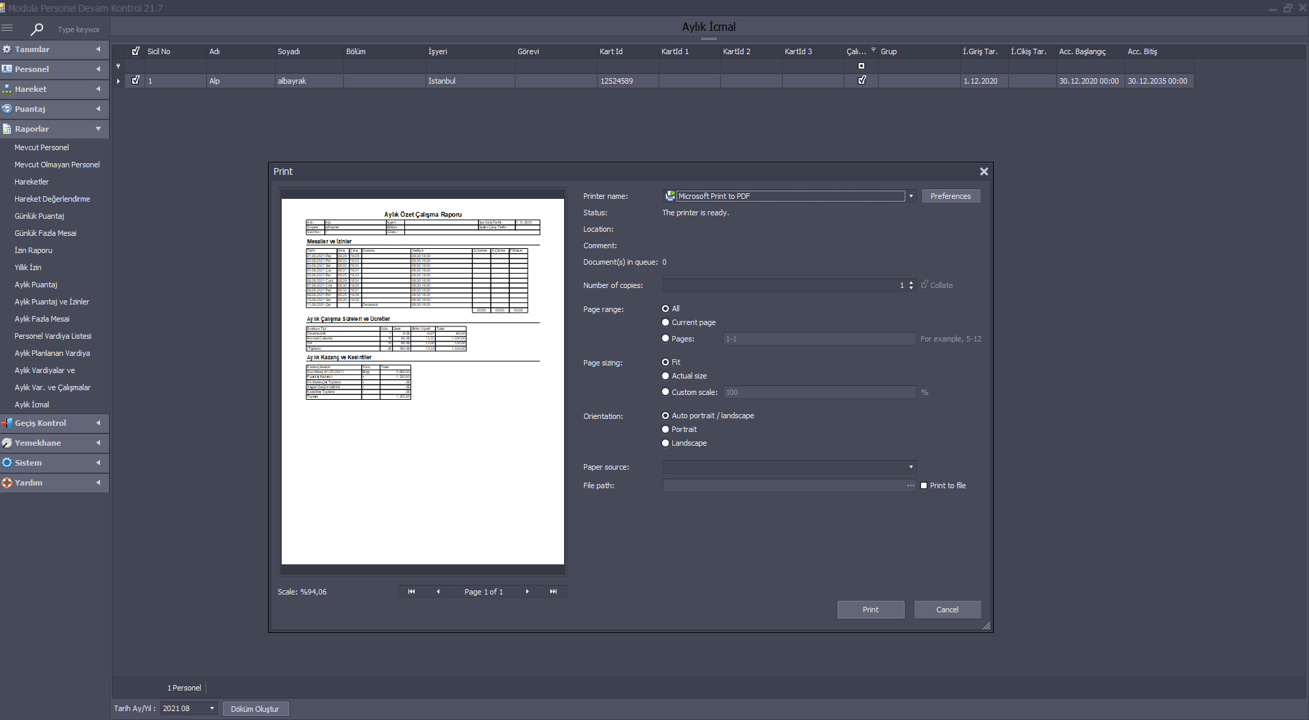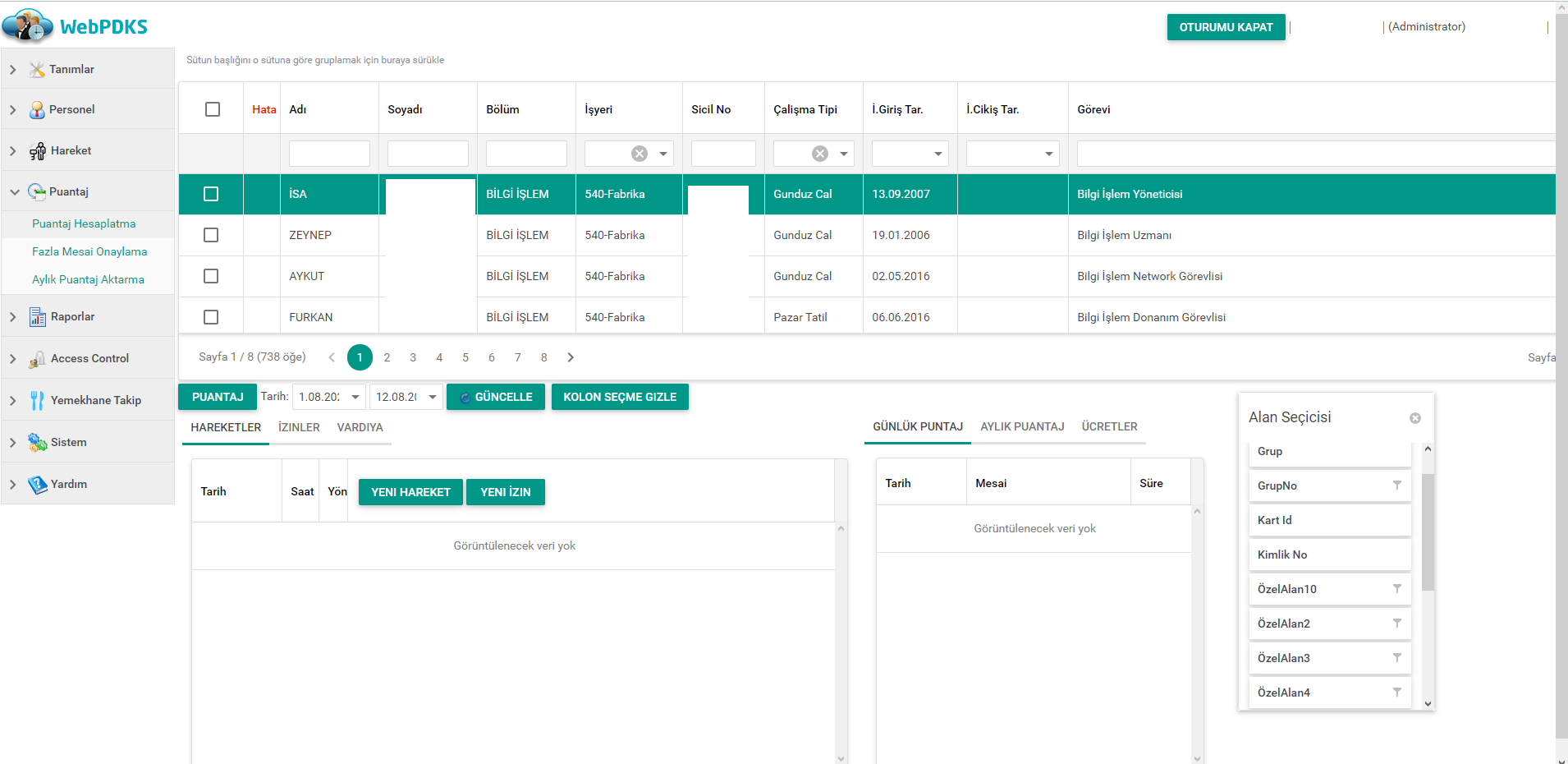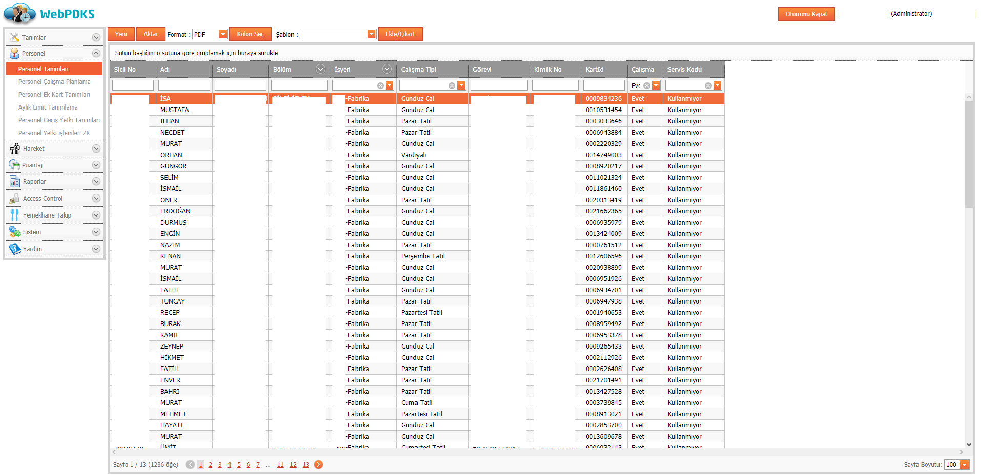 Personel kartları üzerinde dilediğiniz tüm bilgiler kaydedilebilir, bu bilgiler ile filtrelemeler yapılabilir.